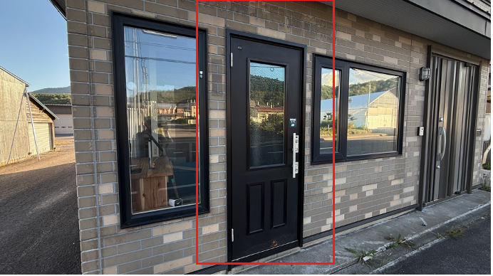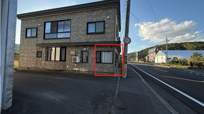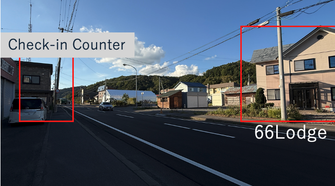 宿の正面道路の向かいの建物一階にオフィスがあります。